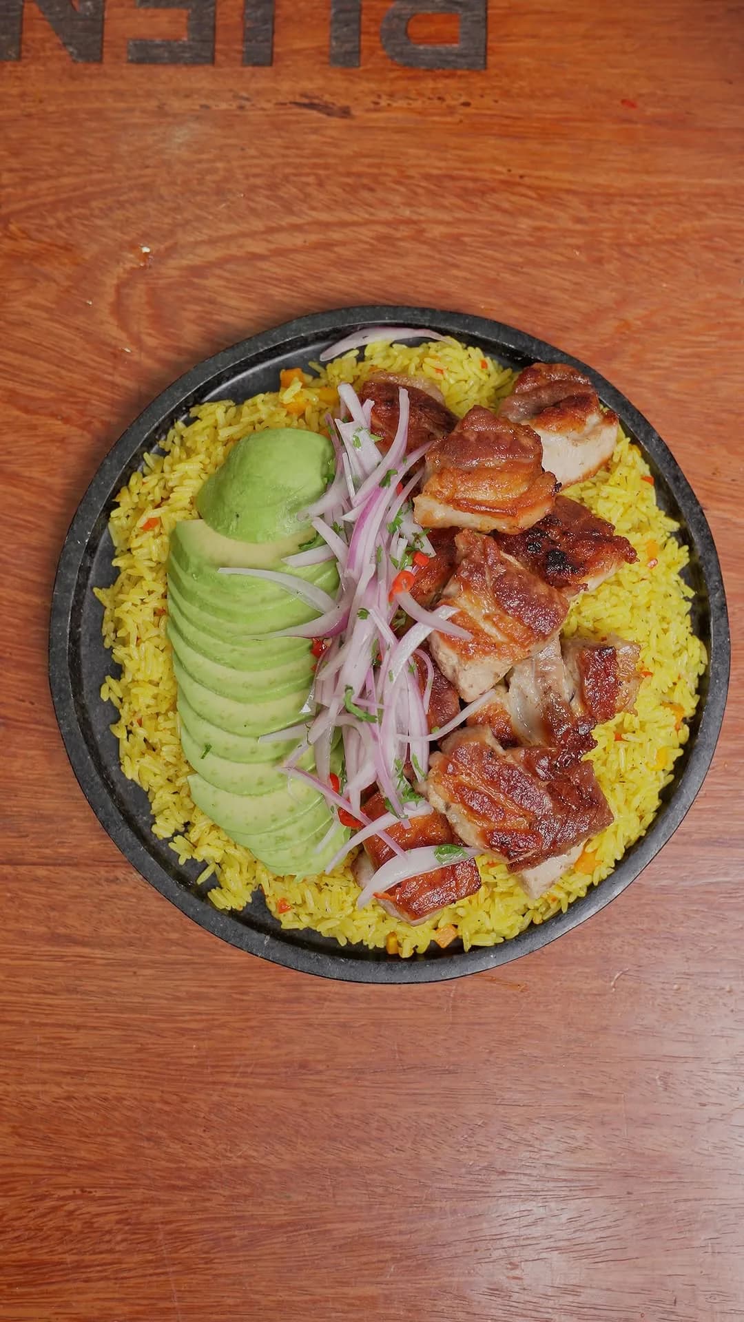Arroz Amarillo con Panceta Dorada y Salsa Criolla