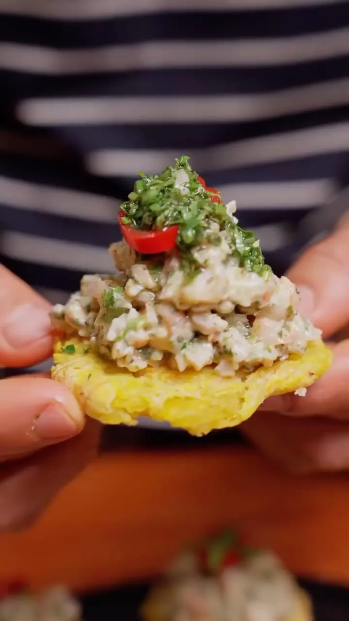 Patacones en Freidora de Aire con Tartar Cremoso de Langostinos al Chimichurri